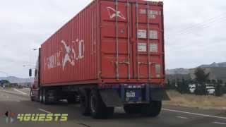 High definition [HD] video footage, a Hamburg Sud Truck heading to the west coast from northern Arizona on interstate 40. The containers are loaded onto a ...